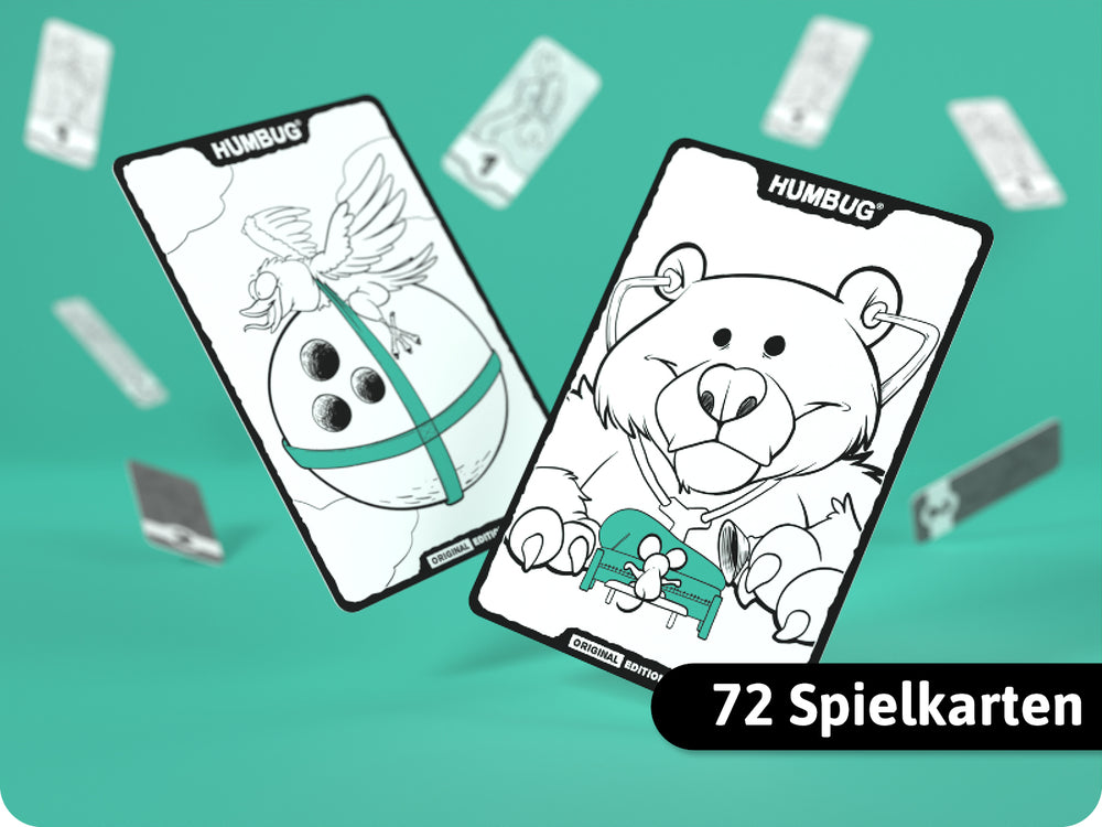 Die HUMBUG - Original Edition Nr.1 beinhaltet 72 Spielkarten mit insgesamt 120 durchgeknallten Bildern.