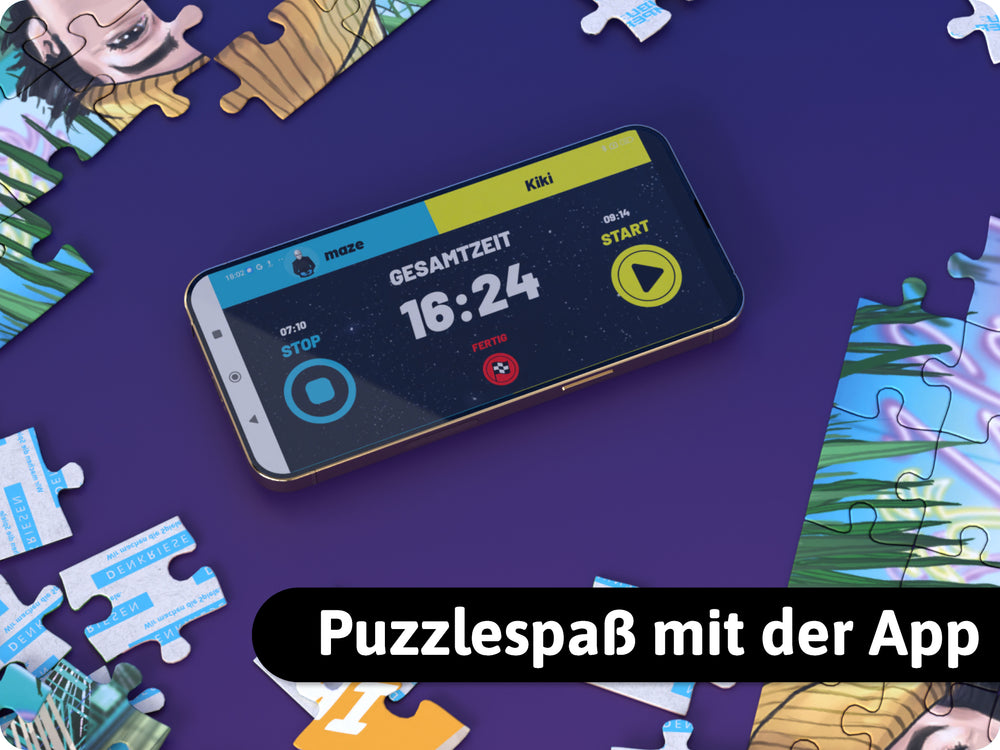 Für den Modus "Flinke Finger" braucht ihr die kostenlose KIBU App. Ihr legt jetzt abwechselnd ein Puzzleteil und drückt nach jedem Legen den Stopp-Button. Das geht nun solange weiter, bis das gesamte Puzzle fertig ist. Gewonnen hat derjenige mit der geringeren Gesamtzeit.
