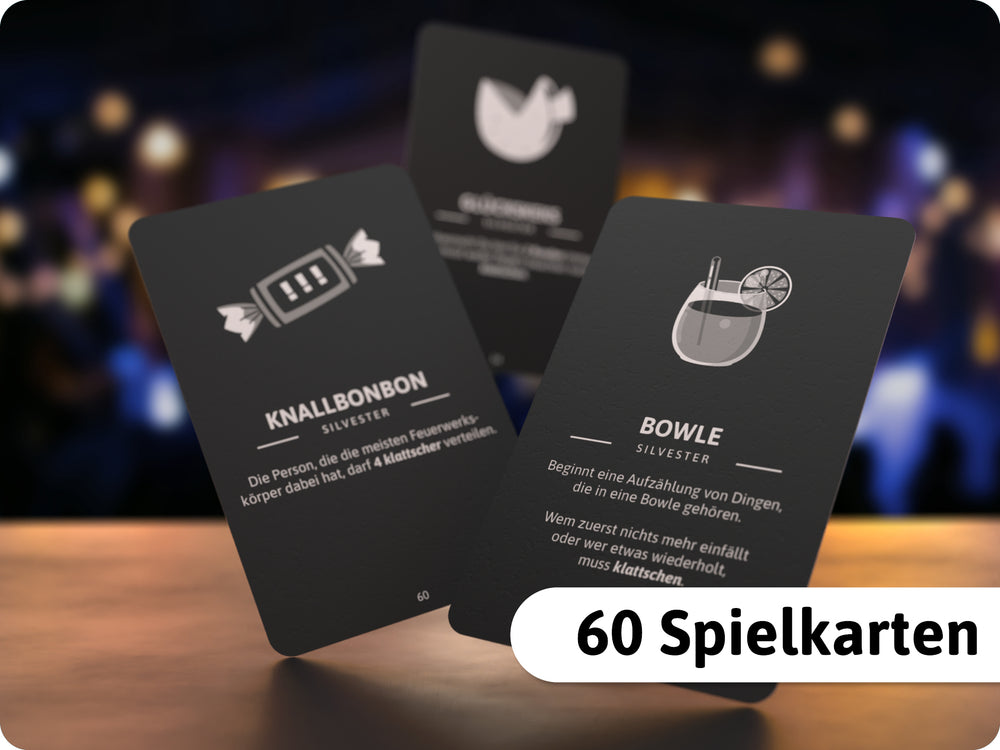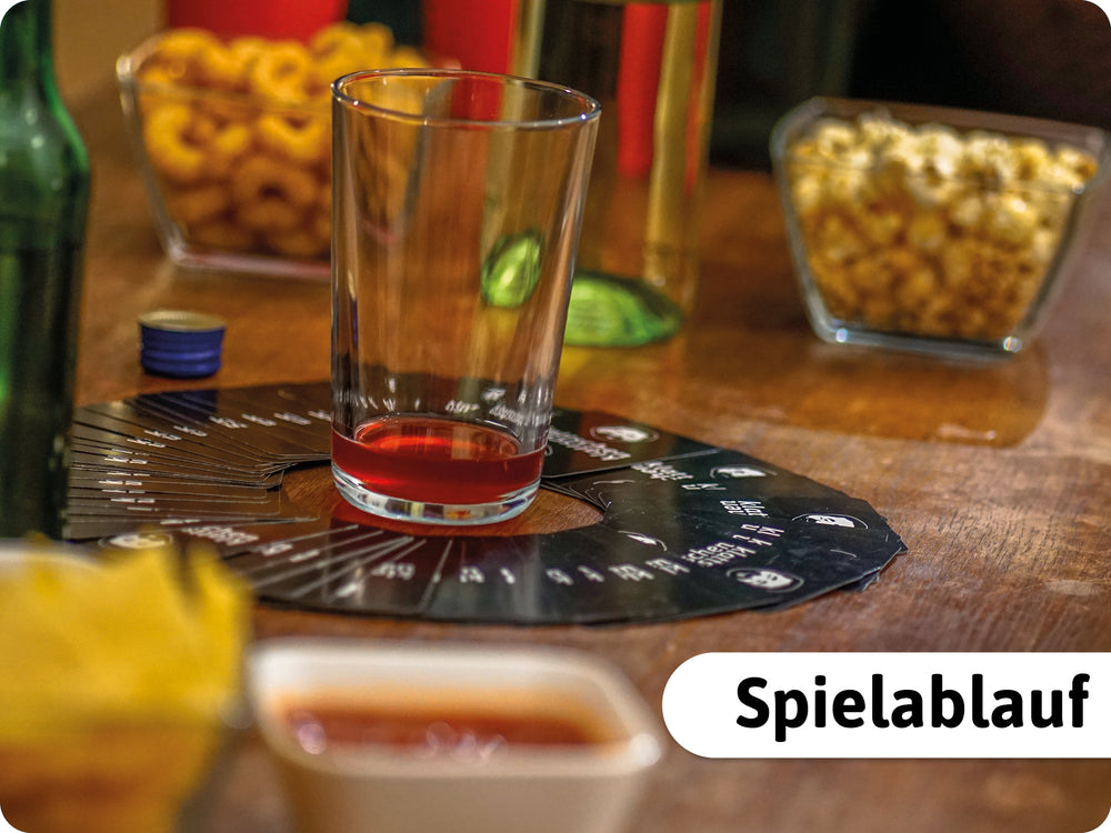 Verteilt alle Karten um das klattsch-Glas herum. Der Reihe nach müssen Karten gezogen und Aufgaben erfüllt werden. Wer sich nicht an die Anweisungen hält oder einen Fehler bei der Ausführung macht, muss trinken (im Spiel ‘klattschen’ genannt).