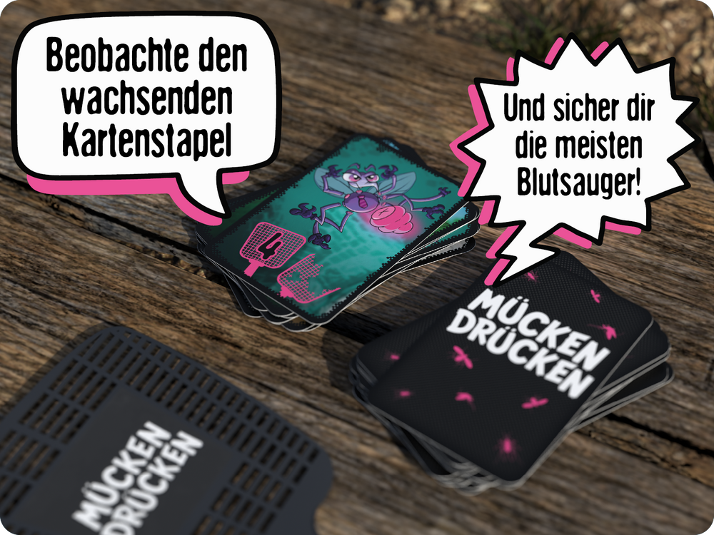 Reihum deckt der Dealer Karten in die Tischmitte auf. Alle Spieler beobachten aufmerksam, denn sobald der richtige Moment gekommen ist, kann man durch schnelles Draufhauen den gesamten Kartenstapel sichern – den „Pott“. Jede Runde endet, wenn alle ihre Pötte beisammenhaben oder das Deck leer ist. Nach drei Runden werden die Punkte gezählt – und nur der beste Mückendrücker gewinnt!