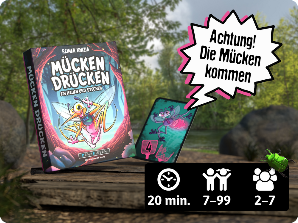 Bei Mückendrücken geht es darum, in drei spannenden Runden die meisten Punkte zu sammeln. Wer am Ende die cleversten Pötte geschnappt und die beste Kartenkombination hat, gewinnt das Spiel.