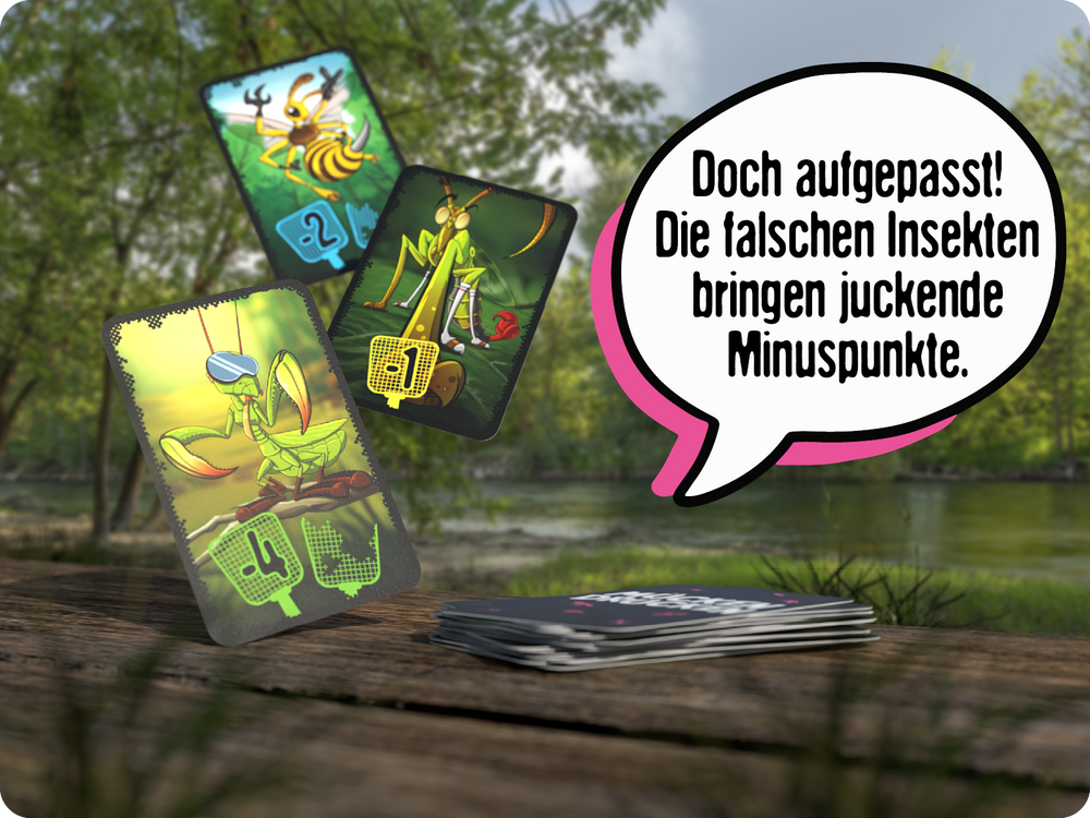 Das Spiel enthält insgesamt 110 Karten mit abwechslungsreichen Funktionen: Punktekarten, Pärchenkarten, Bruzzler, Engerlinge und Fliegenfallen. Sie sorgen für jede Menge Abwechslung und Spannung, denn jede Kartenart bringt eigene Chancen – und Risiken – bei der Wertung mit sich.