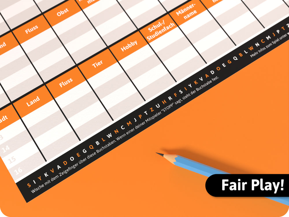 Jeder Spieler erhält eine Seite des DIN-A3 Blockes und legt diese vor sich hin. Es wird eine Zeit pro Durchgang ausgemacht (wir empfehlen 2 Minuten als Begrenzung). Die innovative Buchstabenleiste hilft bei der Ermittlung des Buchstabens. Dann gilt es so schnell wie möglich alle Begriffe einzutragen. Pro Runde sind 8 Begriffe gesucht.