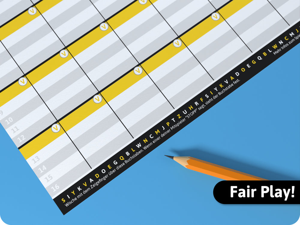 Innovative Buchstabenleiste gegen Schummler. Wische einfach mit dem Zeigefinger über die Buchstabenleiste. Wenn einer deiner Mitspieler “STOPP” sagt, steht der Buchstabe fest, mit dem gespielt werden muss.