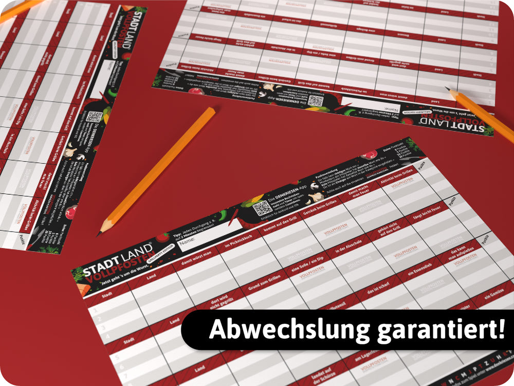 Stadt Land Vollpfosten® Spielblock | Grillparty Edition