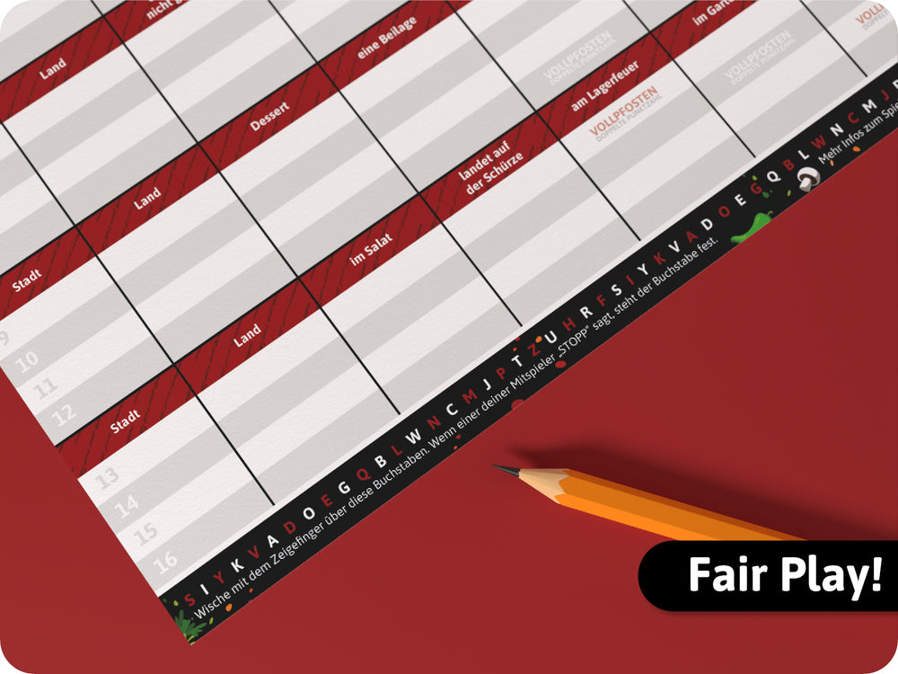 Innovative Buchstabenleiste gegen Schummler. Wische einfach mit dem Zeigefinger über die Buchstabenleiste. Wenn einer deiner Mitspieler “STOPP” sagt, steht der Buchstabe fest, mit dem gespielt werden muss.