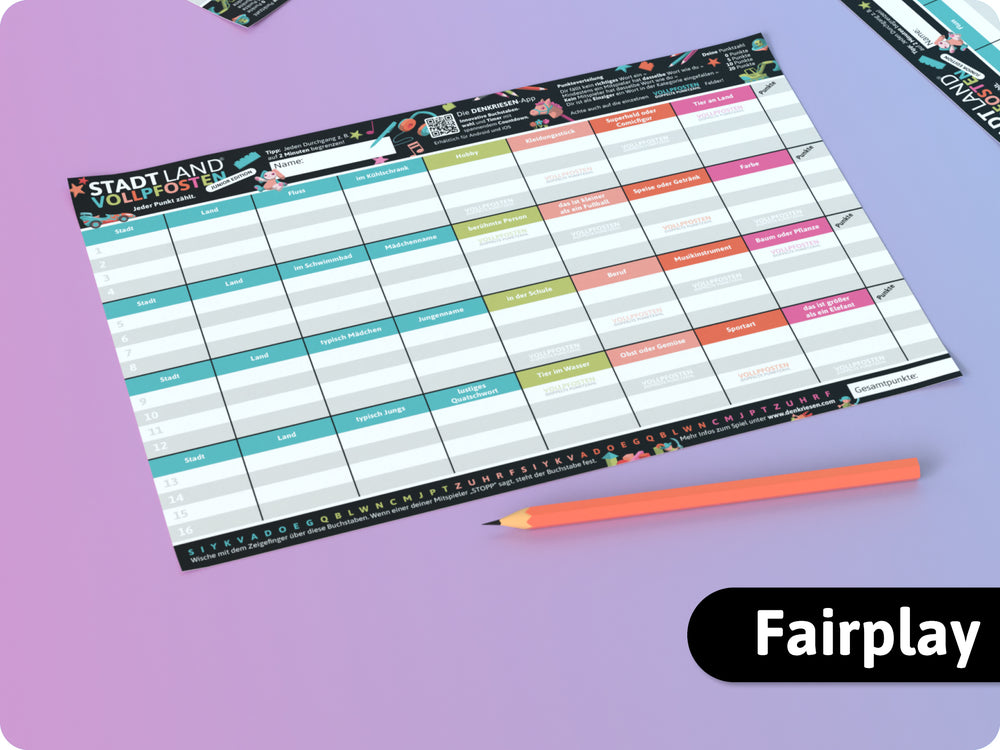 Dieser DIN-A4 Spielblock ist das wahrscheinlich kinderfreundlichste Stadt-Land-Fluss aller Zeiten. 26 kreative und lustige Kategorien für ein unvergessliches Spielerlebnis unter Freuden.