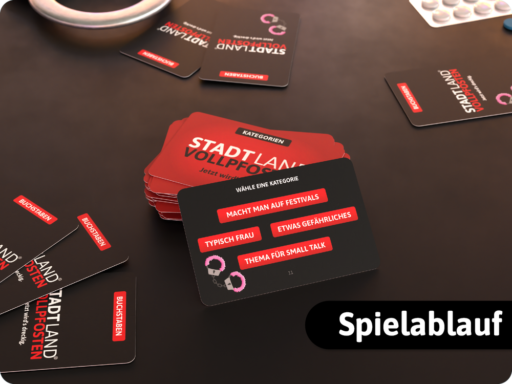 Das Prinzip ist so einfach wie genial. Wer glaubt, dass Stadt-Land-Vollpfosten als Kartenspiel doch nicht gut funktionieren kann wird schnell eines besseren belehrt werden.