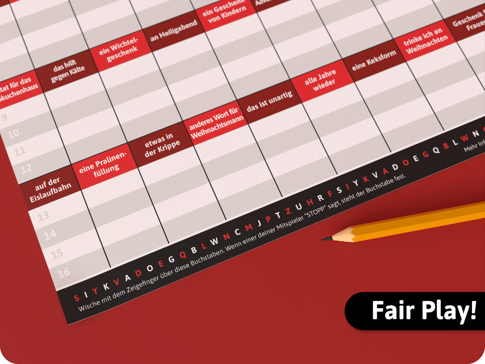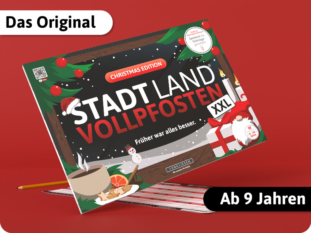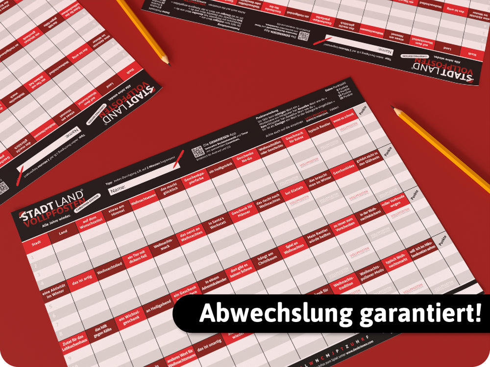Der Klassiker jetzt auch im großen DIN A3 Format! Die Weihnachtliche Edition von STADT LAND VOLLPFOSTEN mit 52 festlichen Kategorien.