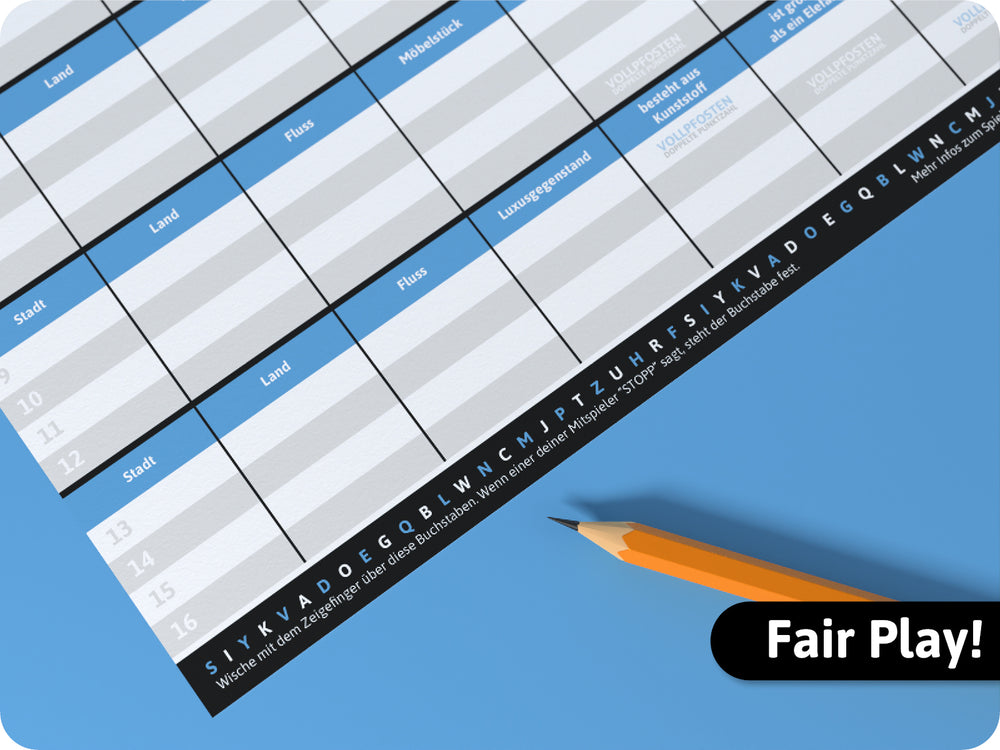 Innovative Buchstabenleiste gegen Schummler. Wische einfach mit dem Zeigefinger über die Buchstabenleiste. Wenn einer deiner Mitspieler “STOPP” sagt, steht der Buchstabe fest, mit dem gespielt werden muss.