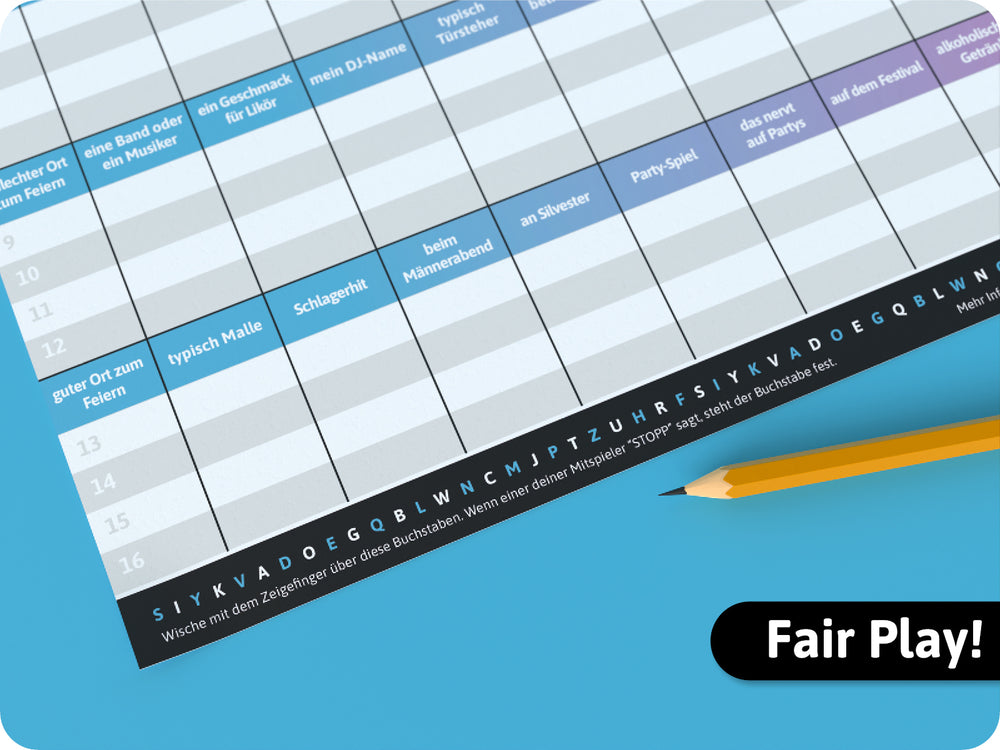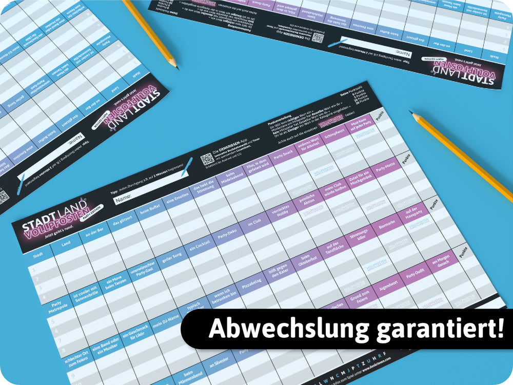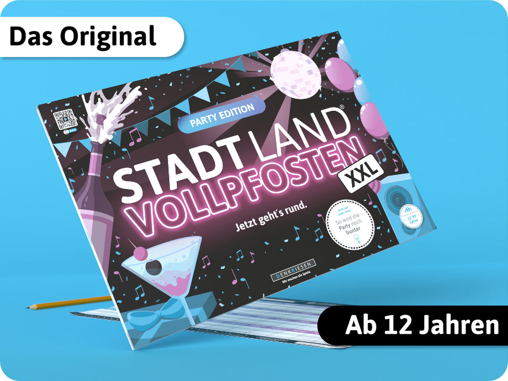 Die Gute-Laune-Edition des Kultspiels STADT LAND VOLLPFOSTEN im A3 Format rund ums Thema Party und Feiern.