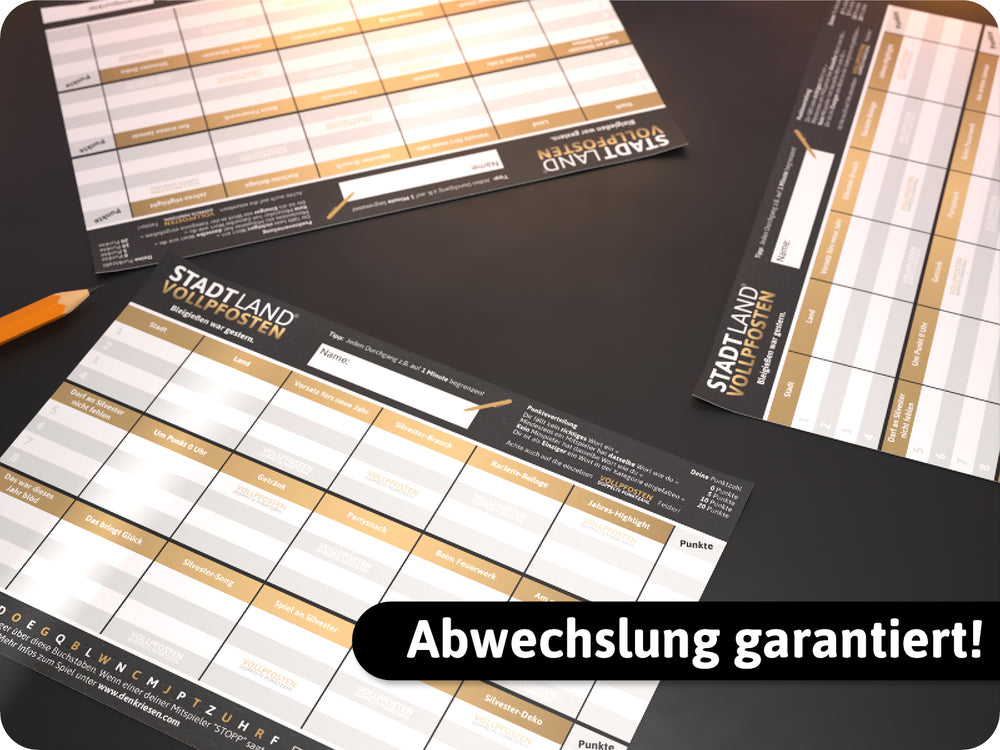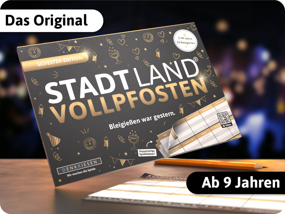 Macht den letzten Tag des Jahres unvergesslich mit der offiziellen Silvester-Edition von STADT LAND VOLLPFOSTEN. Der ultimative Spielblock mit 18 heiteren Kategorien rund um den Jahreswechsel für einen lustigen Silvester-Abend mit Freunden.