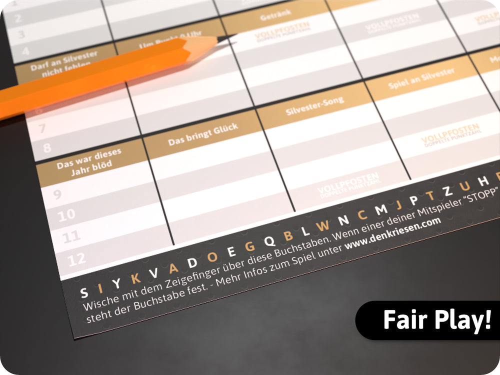 Innovative Buchstabenleiste gegen Schummler. Wische einfach mit dem Zeigefinger über die Buchstabenleiste. Wenn einer deiner Mitspieler “STOPP” sagt, steht der Buchstabe fest, mit dem gespielt werden muss.