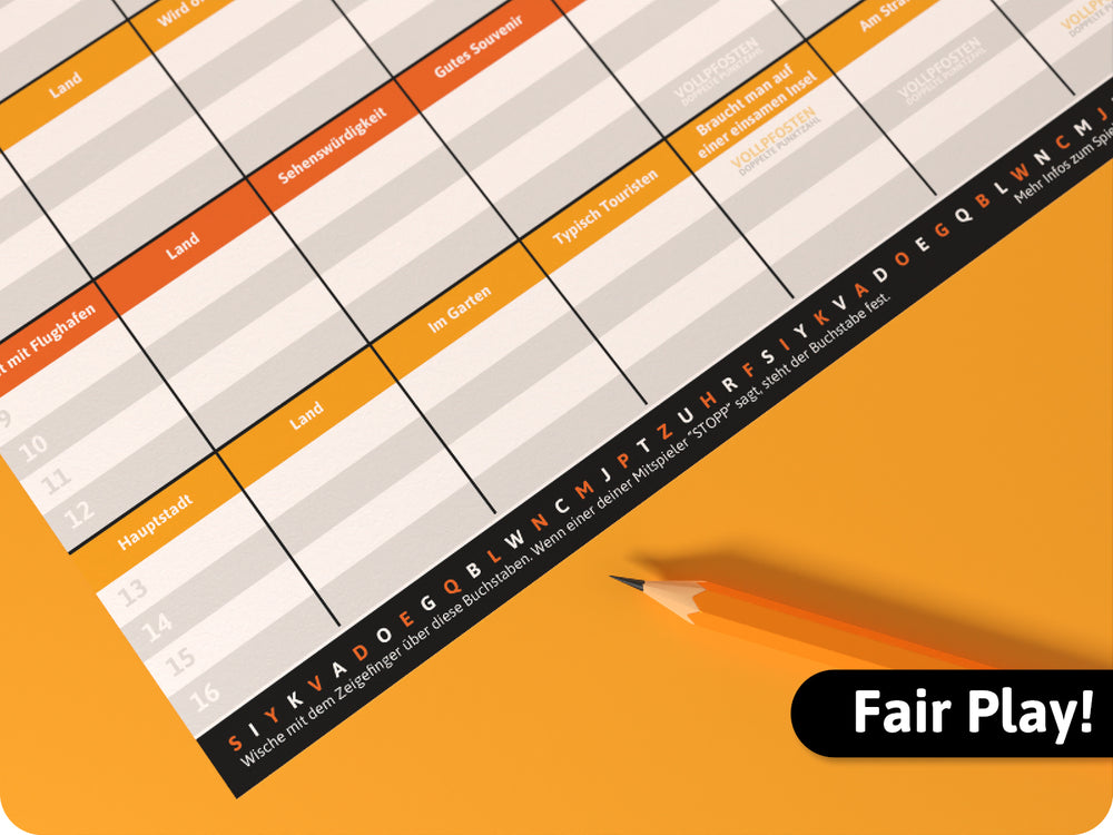 Jeder Spieler erhält eine Seite des DIN-A4 Blockes und legt diese vor sich hin. Es wird eine Zeit pro Durchgang ausgemacht (wir empfehlen 2 Minuten als Begrenzung). Die innovative Buchstabenleiste hilft bei der Ermittlung des Buchstabens. Dann gilt es so schnell wie möglich alle Begriffe einzutragen. Pro Runde sind 8 Begriffe gesucht.