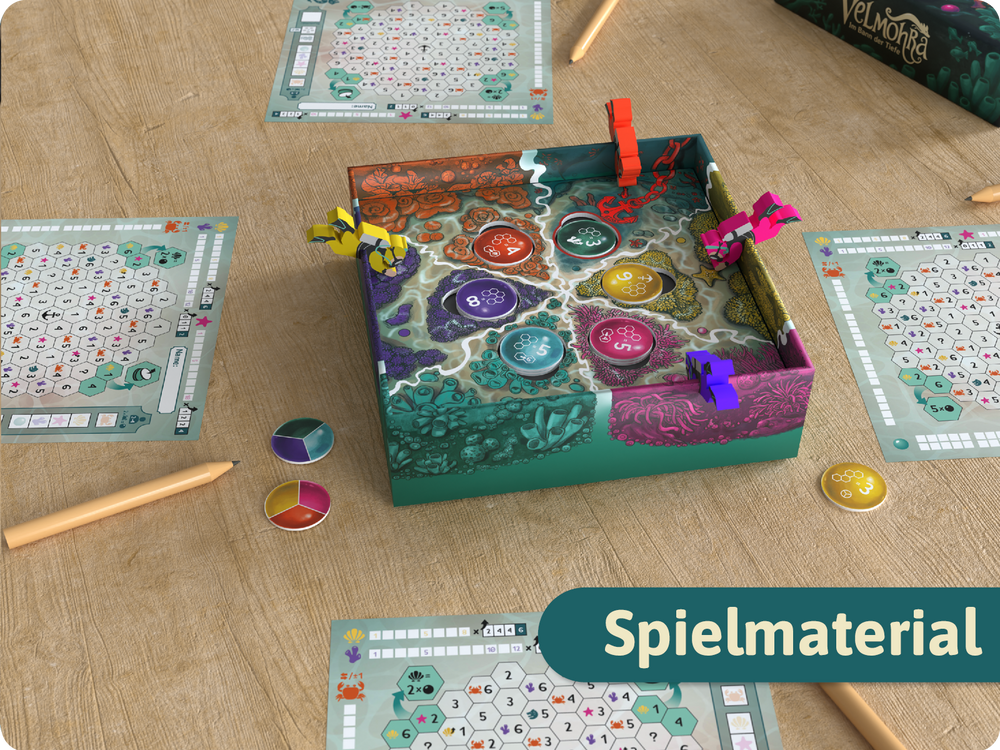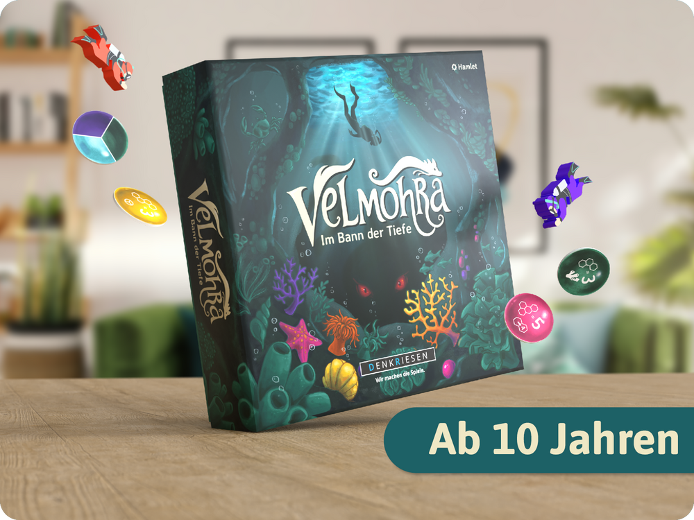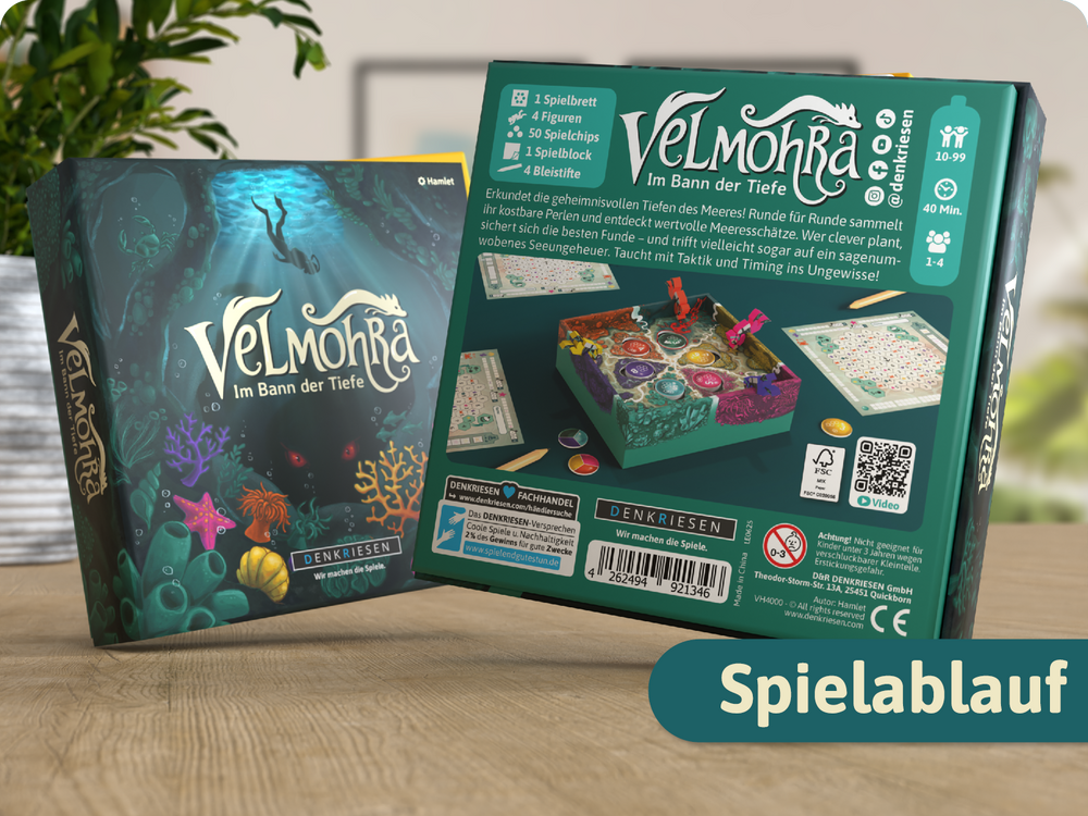 Bei Velmohra taucht ihr Runde für Runde in die geheimnisvolle Grotte ab. Auf dem Tauchplan zeichnet ihr Wege, sammelt Schätze und löst Effekte aus. Mit eurer Taucherfigur bewegt ihr euch gleichzeitig durch die Grotte, um wertvolle Perlenchips zu bergen. Jede Entscheidung bringt euch Punkte – doch auch das Seeungeheuer kann euer Spielende einläuten. Wer am Ende die meisten Punkte gesammelt hat, gewinnt die Expedition.
